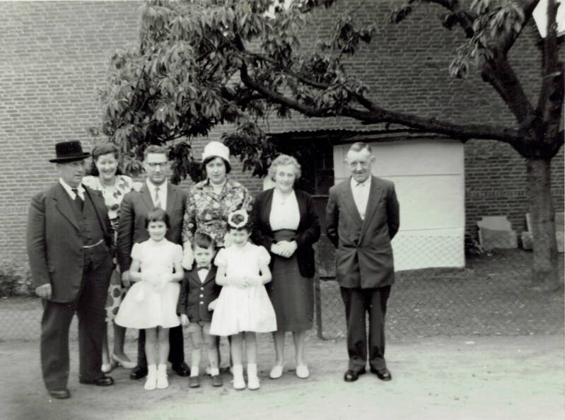Hierboven een foto van Opa en Oma van Berlo met op de voorgrond Riki en Mieke en op de achterste rij staande van links naar rechts: tante Riek met Miep, daarlangs opa en oma dan Mien en tante Truus, op oma's verjaardag in 1955.
