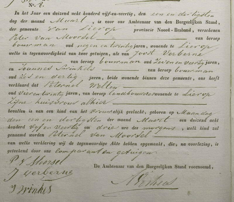 Hierboven de geboorteakte in Lierop, van Petrus van Moorsel, de vader van opa van Moorsel.