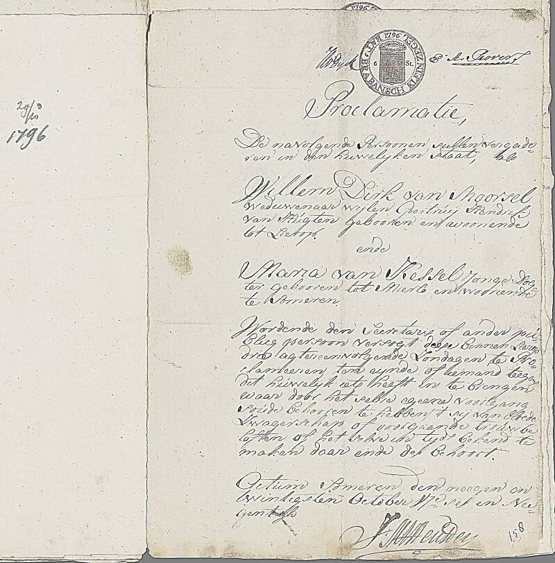 Hierboven en rechts zijn de documenten van het huwelijk tussen Wilhelmus en Johanna Maria op 13 november 1796, bijna 4 jaar na het overlijden van Gertruda in 1793.
